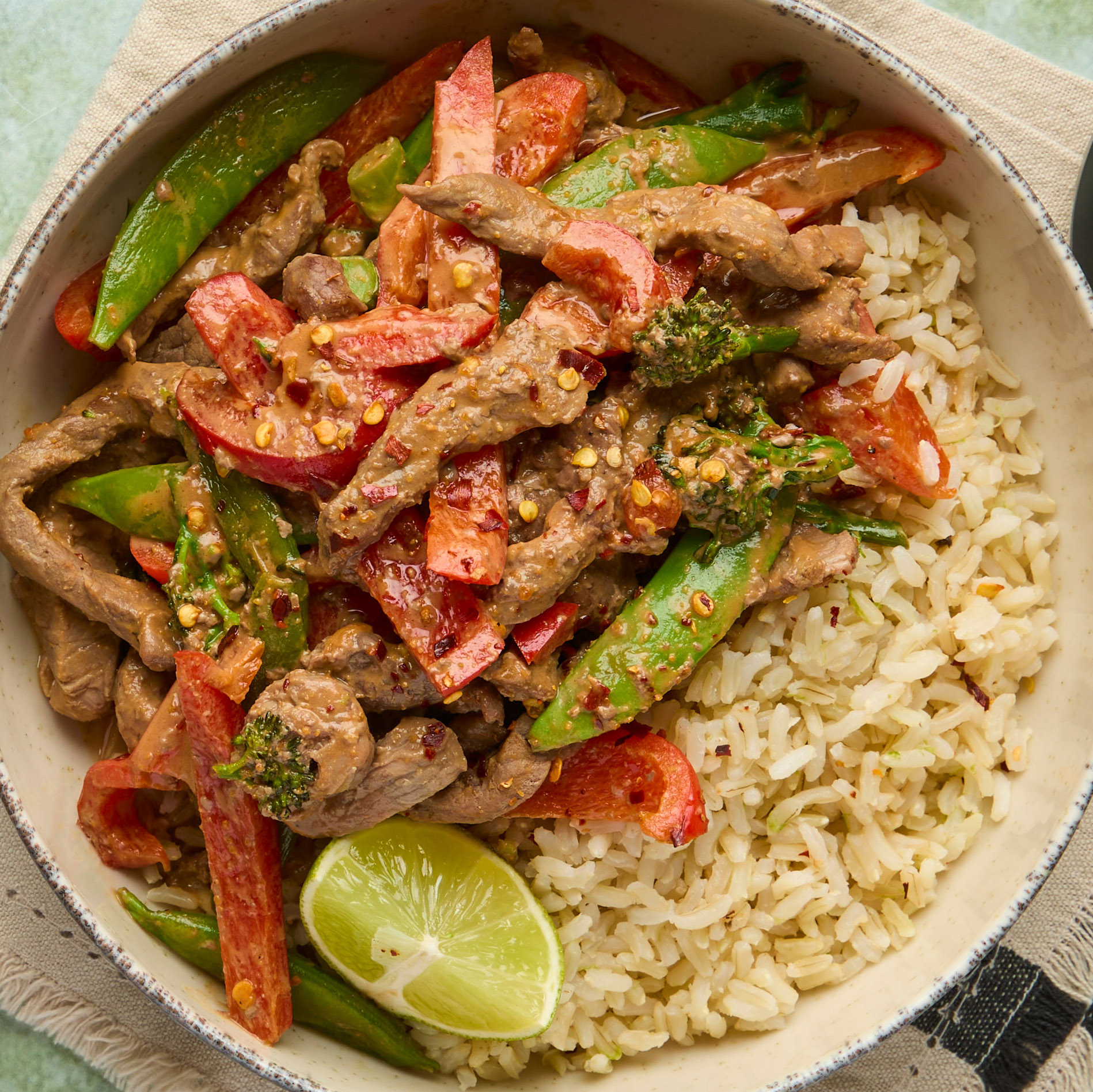 Nothing beats a traybake after a busy day! Simply coat a medley of vibrant veg and high-protein British beef in a more-ish chilli peanut dressing, then roast to perfection. Serve with fluffy brown rice to soak up all the flavour - it only takes 10 mins to prep. |
